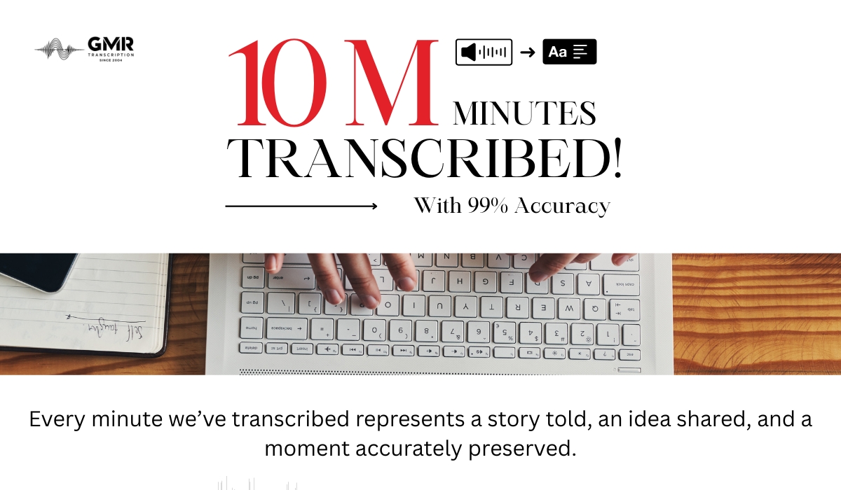 Since 2004, GMR Transcription has set itself apart by prioritizing a fully human approach. Every transcript, whether from legal proceedings, academic research, business discussions, or podcasts, is crafted by trained U.S.-based transcriptionists who deliver precise, context-rich results. Collectively, GMR Transcription’s transcriptionists have dedicated approximately 50 million hours to delivering high-quality, reliable documentation for clients nationwide.