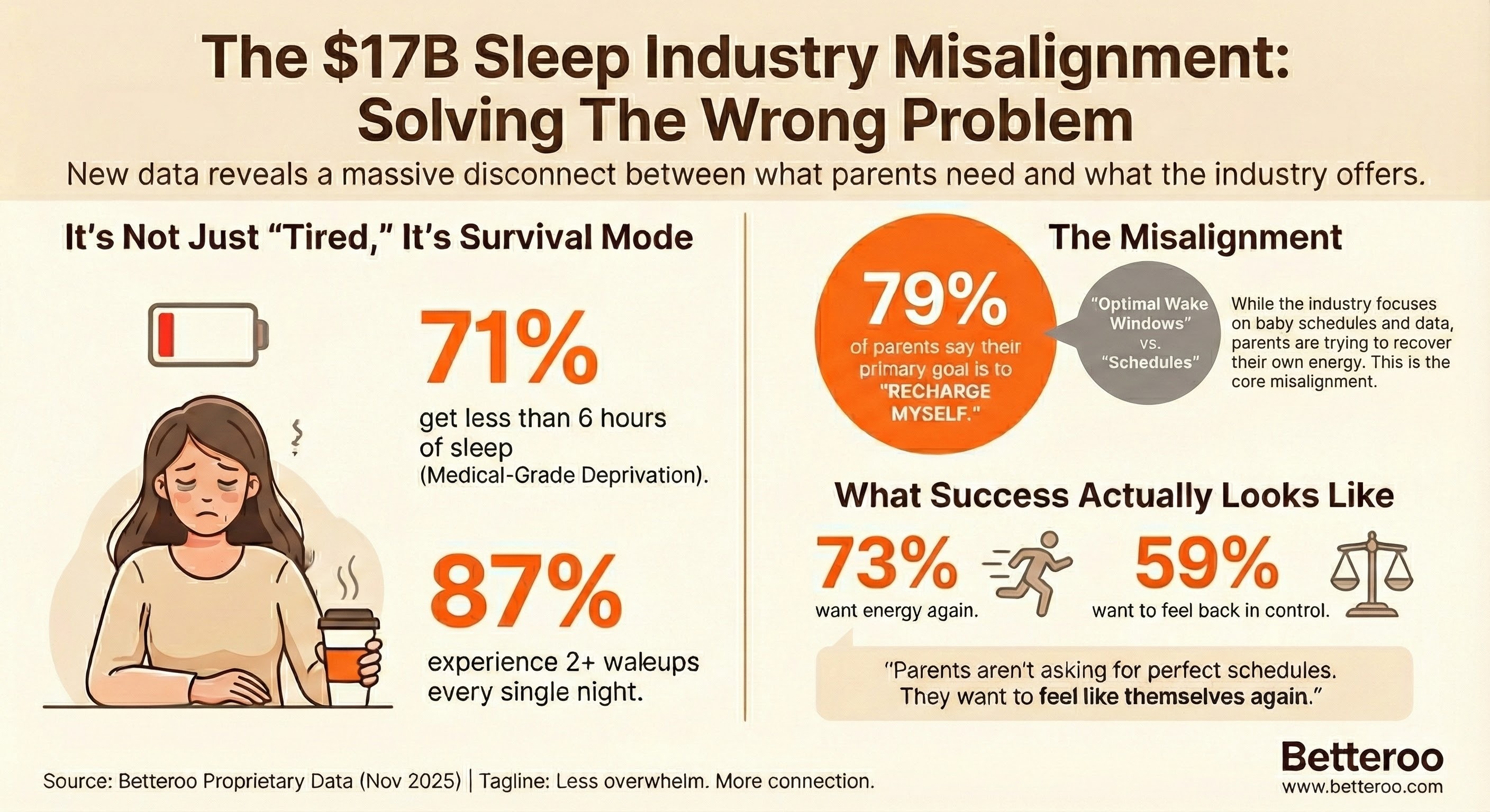 In its analysis of data from thousands of parents seeking help with baby sleep, Betteroo uncovered a powerful pattern: parents aren’t looking for stricter routines or optimized wake windows. They’re trying to feel like themselves again.