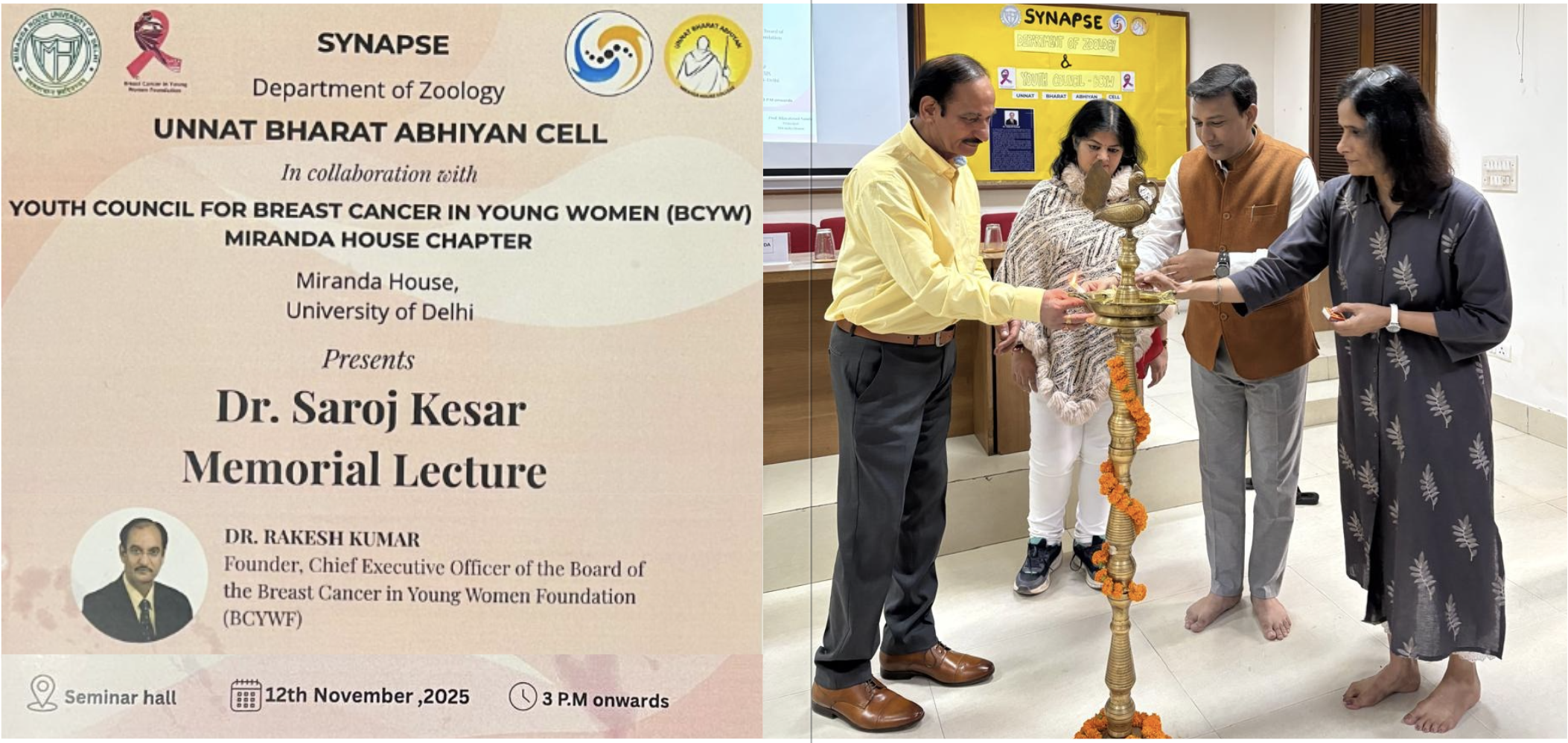Miranda House inaugurated its chapter on November 12, 2025, with an event starting at 3:30 and continuing onward, featuring students, faculty, and college leadership. Faculty-in-Charge, Dr. Nisha Vashishta from the Department of Zoology, led the event. Foundation's Dr. Rakesh Kumar delivered the keynote speech at the annual Dr. Saroj Kesar Memorial Lecture, sharing insights on changing breast cancer trends among young women and emphasizing innovative intervention strategies. The program also included a talk by Dr. Rajeev Ranjan from Ziagnois, who highlighted the importance of diagnostic accuracy.