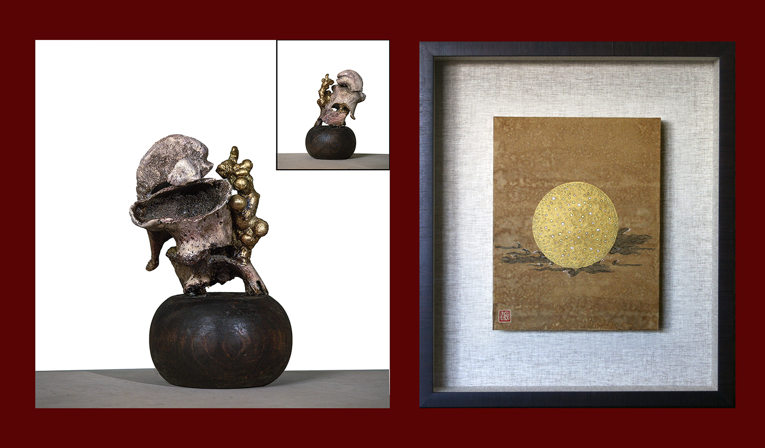 Left: Natalie Giugni, Oracle, 2023, bone, gold leaf and mixed media, 9.5”H x 5.5” W x 5” D Right: Stephenie Lee, Tribute to Sand II (Left panel), 2013, color pigment & ink on Hanji, 23 ¼" H x 20 ¼" W x 2 ¾" D
