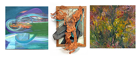 Left to right: Sueim Koo, With the tender touch..., mixed media with collage, 24” H x 36” W. Lori Horowitz, Balance of Liberty, wall relief-copper wire mesh and fiber, 26"H x 20"W X 12"D. Nancy Bueti-Randall, Daffodil, Early Spring, oil on linen, 22” H x 24” W.